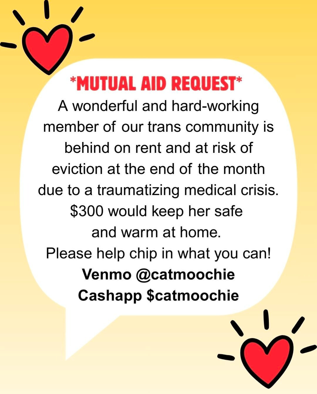 This next one comes from a really good friend. Someone in their circles is in danger of getting evicted at the end of the month, because of a traumatizing medical crisis. Help her make rent -- Venmo and Cashapp: @catmoochie $catmoochie